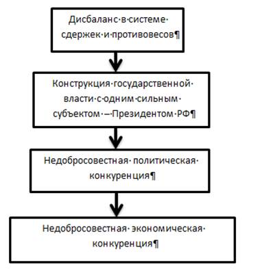 Конституционная модель государственной власти явилась фактором недобросовестной конкуренции в экономики, следствием чего выступает неэффективное функционирование рынка, торможение экономического развития. Разумеется, это лишь один из факторов, но на почве российской действительности он во многом стал ключевым. Конституцией 1993 года, провозгласившей принцип разделения властей с явным дисбалансом в системе сдержек и противовесов — наполнением данного принципа, была введена в действие бомба замедленного действия. Сформировавшаяся конструкция власти с сильным Президентом, проводящим свою политику через аппарат бюрократии, аморфным парламентом и судебной властью, неспособной повлиять на административный произвол, защитить от него граждан, создала политическое пространство с имитацией конкуренции, что в свою очередь дало толчок к возникновению недобросовестной конкуренции в экономике. Для наглядности вышесказанное можно изобразить в виде следующей схемы: