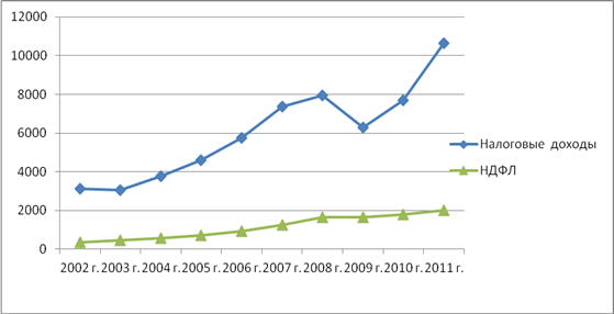 Как видно из рис. 1, поступления НДФЛ в консолидированный бюджет в 2002—2011 гг. имели положительную динамику. Однако некоторые эксперты не связывают данный факт с введением пропорциональной шкалы подоходного налога.