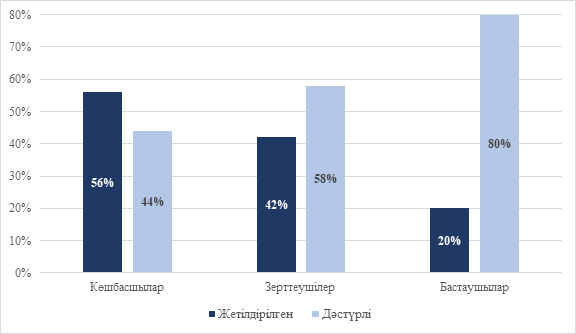 3-суреттегі салыстырмалы талдау жасанды интеллект технологияларын енгізу деңгейі мен деректер инфрақұрылымының даму дәрежесі арасында айқын өзара байланыс бар екенін көрсетеді. Цифрлық көшбасшы ұйымдардың 56%-ы деректер қоймалары мен date lake шешімдерін қоса алғанда, заманауи архитектуралық технологияларды пайдаланады, бұл деректердің қолжетімділігін, интеграциясын және аналитикалық өңделуін жоғары деңгейде қамтамасыз етеді. Цифрлық трансформацияның белсенді кезеңінде тұрған ұйымдарда бұл көрсеткіш 42%-ды құрайды. Ал, цифрландырудың бастапқы деңгейіндегі компанияларда мұндай шешімдерді қолдану үлесі небәрі 20%-ды құрайды, олардың басым бөлігі жасанды интеллект негізіндегі аналитикалық міндеттерге толық бейімделген ERP-жүйелер мен дәстүрлі дерекқорларға сүйенеді [8].