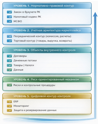 В рамках проведенного исследования разработана авторская модель учета и внутреннего контроля маркетплейса Республики Казахстан, представленная на рисунке 1. Предлагаемая модель носит комплексный характер и базируется на интеграции учетных и контрольных функций в условиях цифровой платформенной экономики. Модель включает пять взаимосвязанных уровней, каждый из которых выполняет самостоятельную методическую и прикладную функцию. [1, 2]