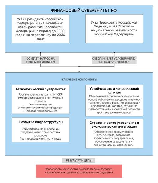 В российском контексте финансовый суверенитет опирается на стратегические документы, такие как Указ Президента Российской Федерации «О национальных целях развития Российской Федерации на период до 2030 года и на перспективу до 2036 года», Указ Президента Российской Федерации «О Стратегии национальной безопасности Российской Федерации» [1,2].