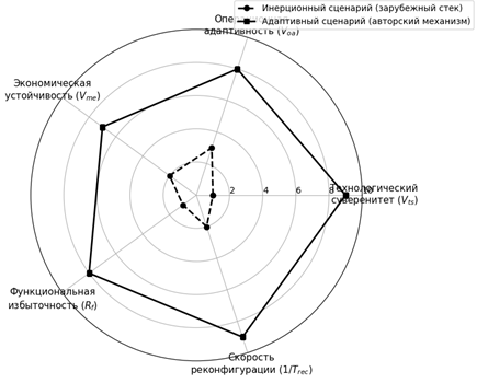 Как видно из профиля (рис. 2), адаптивный сценарий демонстрирует кратное превосходство по вектору технологического суверенитета и времени восстановления. Экономическая эффективность такой модели подтверждается минимизацией потенциальных убытков от блокировки импортных систем [8, 10]. В рамках апробации теоретической модели было проведено сценарное ранжирование реакций на типовые «шоки» (табл. 1).
