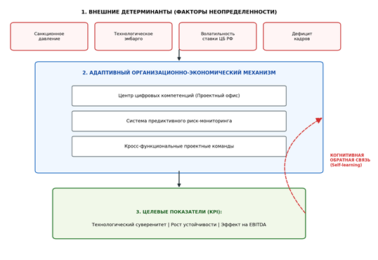 На основе выявленного пробела выдвигается научная гипотеза: устойчивое развитие высокотехнологичных предприятий возможно при наличии адаптивного организационно-экономического механизма, обеспечивающего предиктивное стресс-тестирование цифрового ядра [6]. Для проверки гипотезы автором разработан индекс адаптивной витальности (
