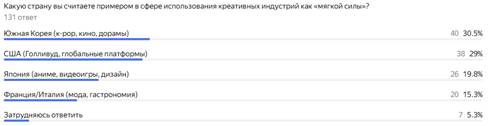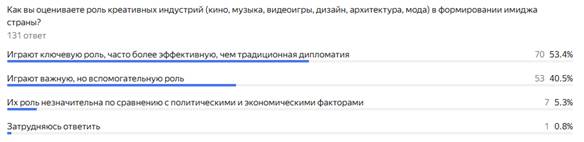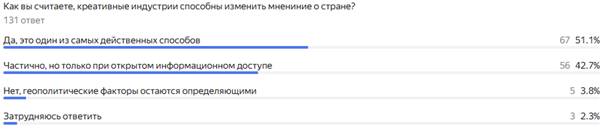 Для обоснования востребованности креативных индустрий как мягкой силы был проведен опрос на широкую аудиторию. Всего собрано 131 анкеты для выявления устойчивых тенденций в общественном мнении.