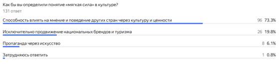 Результаты (Рис.2) показали четкое понимание аудитории о концепции «мягкой силы». На основе проведенного анализа можно сделать следующие выводы: