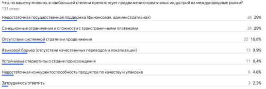 Результаты опроса (Рис.4) выявили две доминирующие группы барьеров: недостаточная государственная поддержка (финансовая, административная), санкционные ограничения и сложности с трансграничными платежами. Обе проблемы для аудитории являются болезненными.