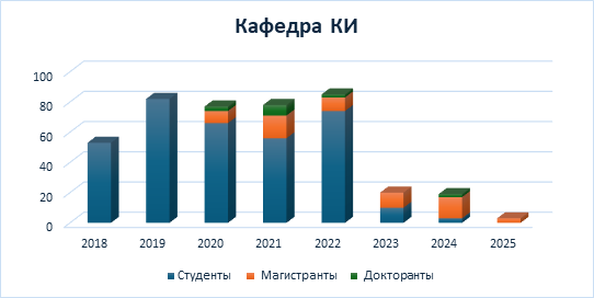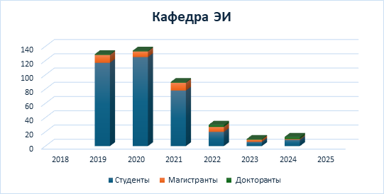 Как видно из рисунка 3, объем финансирования по проектам института претерпел значительные изменения за последние годы. В 2021 году наблюдался пик финансирования, после чего произошел резкий спад. Однако с 2023 года отмечается постепенное восстановление, особенно по проектам кафедры «Телекоммуникационной инженерии» (ТИ), финансирование которых выросло с 36 млн тенге в 2023 году до 118 млн тенге, прогнозируемых на 2025 год. Стабильное финансирование кафедр «Электронной инженерии (ЭИ)» и «Космической инженерии (КИ)» остается на уровне около 200 млн и 358 млн тенге соответственно.