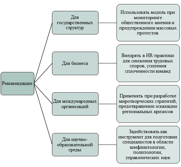 В самой модели предполагается сочетание фундаментального знания о природе конфликтов и технологических инноваций, посредством чего создаётся универсальный «каркас» для анализа и регулирования в разных сферах. Так, рекомендации по практическому применению представлены на рисунке 2.