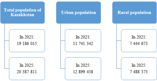 Over the past five years, the ratio between urban and rural populations in Kazakhstan has changed significantly. In 2000, urban residents made up about 56% of the total population, whereas by 2023 this figure exceeded 60%. The rate of migration from rural to urban areas has intensified, particularly among young people—reflecting a global trend. Urbanization indicators in recent years demonstrate that rural regions are experiencing stagnation. According to data from July 1, 2025, Kazakhstan’s total population reached 20,387,811 people, of which 12,899,438 were urban residents and 7,488,373 lived in rural areas [4]. Compared to 2021, these figures indicate a significant overall population increase (Figure 1).