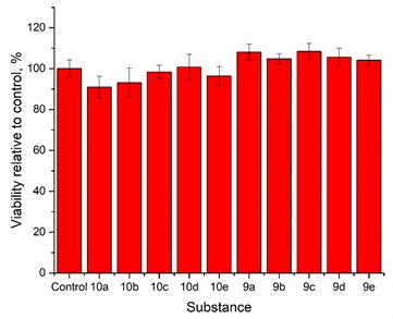 Рисунок 1. Результаты резазуринового теста (процент выживаемости клеток линии Vero) для соединений 9 a-d и 10 a-d (С= 10-2 М в ДМСО/питательной среде) с чистой питательной средой в качестве положительного контроля