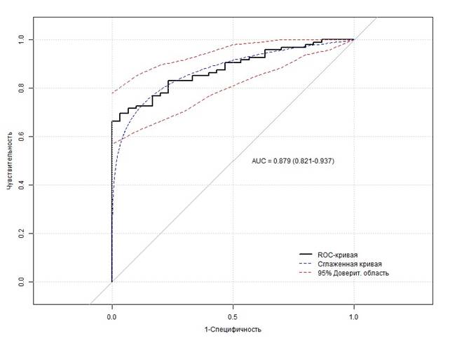Площадь под ROC-кривой (AUC) составила (с 95% ДИ) AUC = 0,879 (0,821-0,937). В качестве порога отсечения была выбрана вероятность P₀ = 0,476. При данном пороге отсечения чувствительность равна Se = 77,89%, специфичность Sp = 76,67%, точность Acc = 77,6%, положительная прогностическая значимость – 91,36%, отрицательная прогностическая значимость – 52,27%.