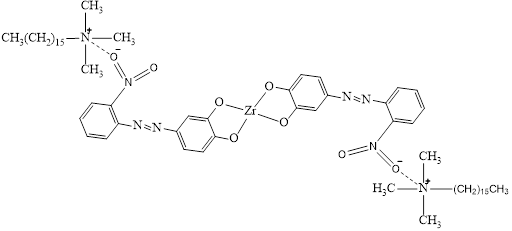 Orthonitrobenzolazopyrocatechin was synthesized according to the procedure described in [4, p.383] and purified by recrystallization from alcohol. Using the titanometric titration method, the percentage content of each reagent was determined [5, p.386]. The purity of the reagent was 99.9%, and its molecular structure is as follows.