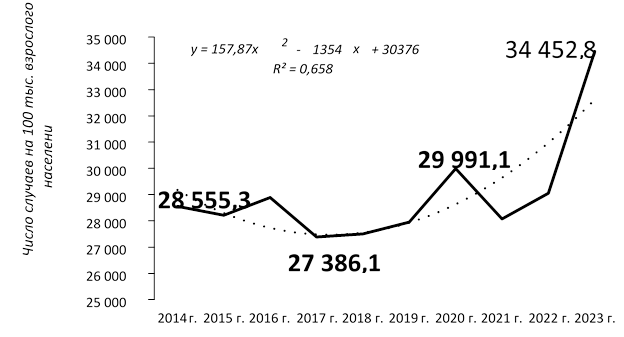 За последние 10 лет распространённость БСК в РТ выросла на «+»17,1% или с 28 555,3 случаев на 100 тыс. взрослого населения за 2014 г. до 34 452,8 за 2023 г. (см. рис. 1). Указанное увеличение происходило не всегда прямолинейно. Начавшийся в РТ рост показателя распространённости БСК в 2015 г., сменился небольшим снижением на следующий год (за 2017 г. – 27 386,1 случаев на 100 тыс. взрослого населения), но продолжил увеличение в 2017 г., достигнув пика в 2020 г. (29991,1 просантимилле) и после одногодичного снижения показатель «ушёл в отрыв» до своего современного значения (см. рис. 1).