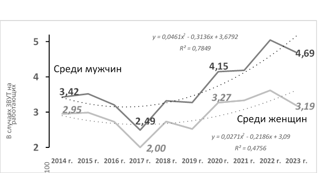 За последние 10 лет ЗВУТ в случаях от БСК вырос на «+»37,1% или с 3,42 на 100 работающих за 2014 г. до 4,69 за 2023 г. среди мужчин и только на «+»8,1% или с 2,95 на 100 работающих за 2014 г. до 3,19 за 2023 г. среди женщин (см. рис. 2). Данные изменения происходили также непрямолинейно, наибольший рост заболеваемости происходил с 2017 г. до 2021 г., а к 2023 г. уровень показателя несколько снизился.