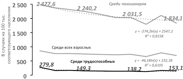 За последние десять лет отмечено снижение смертности (см. рис. 3) среди трудоспособных на «-»45,3% (с 279,8 на 100 тыс. соответствующего населения в 2014 г. до 153,1 – в 2023 г.) и среди пенсионеров на «-»26,0% (с 279,8 до 153,1 просантимилле).