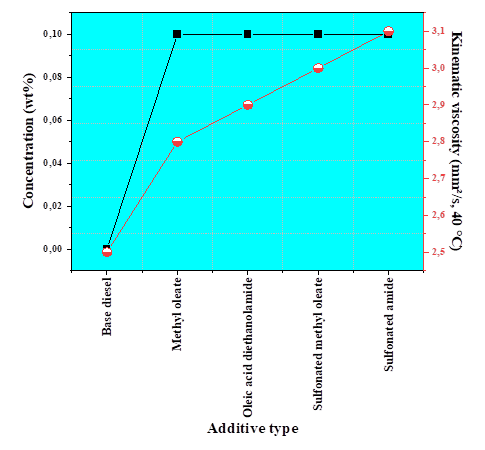 The graph illustrates the variation in kinematic viscosity (left axis) and fuel stability (right axis) with increasing additive concentration. As shown by the red curve with circular markers, the kinematic viscosity of base diesel (2.5 mm²/s at 40 °C) gradually increases to 3.1 mm²/s as the additive concentration reaches 0.1 wt%. This slight rise remains within the ASTM D975 standard limits, indicating that the additives enhance lubricity without negatively affecting fluidity. The black curve with square markers represents the fuel’s stability, which remains constant throughout the concentration range, confirming excellent miscibility and absence of phase separation after 30 days of storage. Overall, the trend demonstrates that bio-based sulfonated additives improve viscosity and ensure long-term homogeneity, making them effective for enhancing the lubricity and stability of ultra-low sulfur diesel fuels.