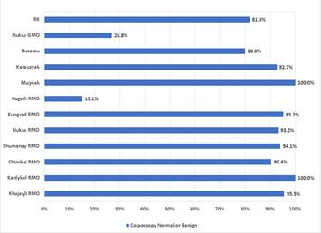 Анализ показывает, что диапазон выявления ВПЧ варьировал от 4,7 % (Муйнакский район) до 8,5 % (г. Нукус). Частота встречаемости ВПЧ в сельских регионах варьировалась от 4,7 % до 6,8 %, исключение составил только Канлыкульский район, где ВПЧ был зарегистрирован у 7,6 % женщин. Чем ближе к городскому региону, тем выше была встречаемость вируса среди женского населения и варьировалась от 8,0 % (Нукусский район) до 8,5 % (г. Нукус). 237 ВПЧ-положительных женщин с выявленными минимальными поражениями на шейке матки прошли лечение (термоабляцию или радиоволновую коагуляцию) в поликлинике.