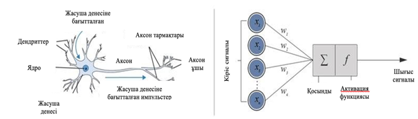 Сурет 1. Биологиялық нейрон мен жасанды нейронның құрылымдық сәйкестігі