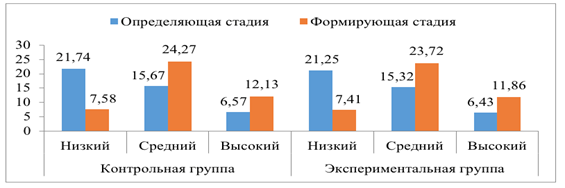 Выводы. Результаты первоначального эксперимента показали, что две группы имели одинаковые уровни стрессоустойчивости, что позволило сравнить их на формирующем этапе. По окончании курса показатели учителей в экспериментальной группе значительно улучшились: увеличилось число тех, кто достиг высокого уровня, и уменьшилось число тех, кто находится на низком уровне. Это показывает, что практика mindfulness эффективна для учителей в управлении стрессом, саморегуляции и улучшении общего качества жизни.