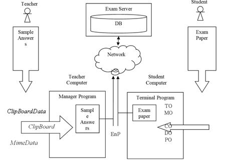 ЕС позволяет студентам и преподавателям обмениваться данными или создавать гиперссылки на системы управления образованием и необходимую информацию для доступа к информации об организации экзаменов, организации, проводящей оценку, предварительным и последующим экзаменационным работам, а также к информации и результатам экзамена, таким как образцы ответов. EnP выполняет функцию шифрования различных данных, связанных с экзаменом, с помощью нашего специального алгоритма шифрования, в то время как InT выполняет функцию поддержки представления декларативных задач, а также ввода и редактирования ответов. LoT осуществляет контроль нагрузки на экзаменационные серверы, запрашивая все службы, связанные с экзаменом, с помощью нашего специального алгоритма контроля нагрузки.