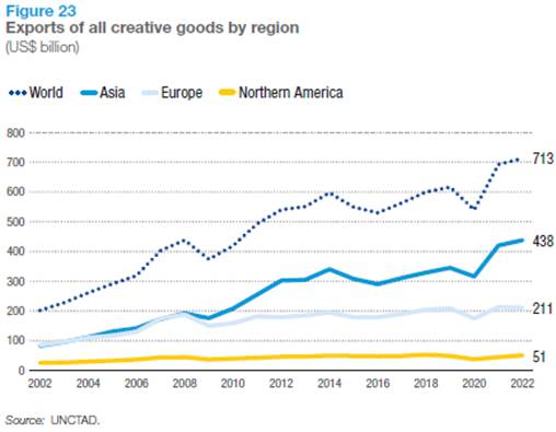 Креативные отрасли вносят существенный вклад в международную торговлю товарами (Рисунок 1) [8с. 23]. Мировой экспорт креативных товаров увеличился с 208 млрд долларов США в 2002 году до 713 млрд долларов США в 2022 году. Азия является крупнейшим экспортером креативных товаров (с экспортом креативных товаров на сумму 438 млрд долларов США в 2022 году), за ней следуют Европа (211 млрд долларов США) и Северная Америка (51 млрд долларов США). Китай продолжает усиленный экспорт креативных товаров Азии, поскольку на одну эту страну приходилось 35% мирового экспорта креативных товаров в 2022 году. Латинская Америка и Карибский бассейн (с экспортом креативных товаров на сумму 8 млрд долларов США в 2022 году), Африка (2,4 млрд долларов США) и Океания (1,6 млрд долларов США) экспортируют значительно меньше по сравнению с другими регионами [8, с.31].