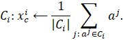 как среднее значение соответствующих координат всех точек, относящихся к данному кластеру (центр масс) по формуле (3):