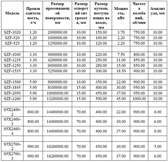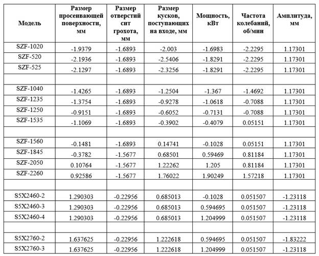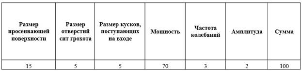 Для проведения многокритериального анализа была собрана таблица 1 марок грохотов с параметрами для оценивания. Следует отметить что анализ должен проводиться для грохотов с одинаковой производительностью или сравнимых по параметрам грохотам.