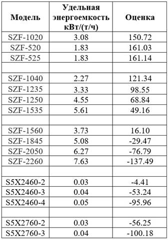 Основываясь на вышеприведённой таблице, можно сказать, что грохоты SZF-525, SZF-1040, SZF-1560, S5X2460-2, S5X2760-2 будут более рациональным выбором в своей группе производительности, поскольку они получили наивысшую оценку в многокритериальном анализе. Также подтверждается то, что многокритериальный анализ даёт более точную оценку при выборе грохотов, и его результаты позволяют сделать близкий, но более корректный выбор по сравнению с выбором, основанным на удельной энергоёмкости.