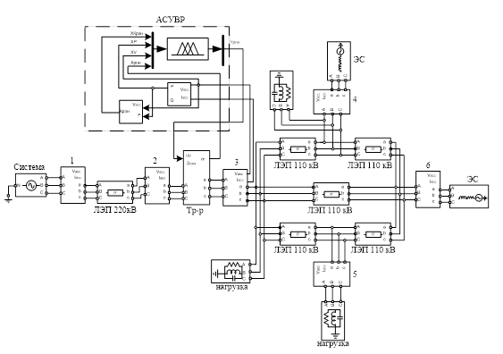 Для проверки основных положений и работоспособности автоматизированной системы управления была создана имитационная модель в программном комплексе MatLAB Simulink с пакетом расширения Fuzzy Logic Toolbox рисунок 1. Она состоит из: энергодефицитной системы, системы бесконечной мощности и перегруженной линии межсистемной связи ЛЭП 220кВ. Автоматизированная система управления на рисунке обозначена как АСУВР.