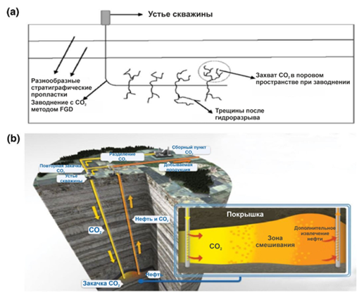 При хранении углекислого газа в нефтяном пласте, CO₂ способствует повышению нефтеотдачи [16, с. 389]. На рисунке 2 показана схема хранения углекислого газа в пласте-коллекторе (a), и схема увеличения нефтеотдачи (b).
