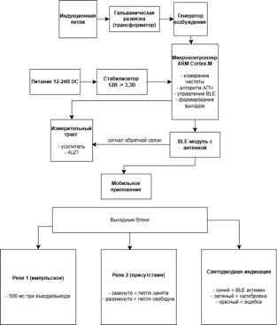 На рисунке 1 представлена структурная схема разработанного контроллера. От петли на микроконтроллер через трансформатор поступает сигнал, он управляет генератором возбуждения, образуя алгоритм автоматической подстройки частоты, а также этот сигнал взаимодействует с BLE-модулем и формирует сигналы на реле и светодиоды.