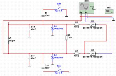 На рисунке 2 представлен фрагмент собранной модели, имитирующий работу преобразования сигнала с индукционной петли в цифровые импульсы для микроконтроллера [7].