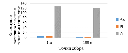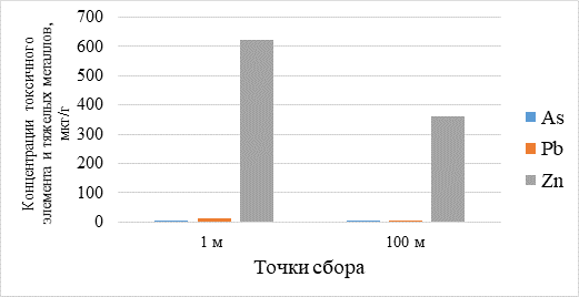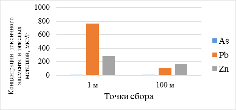 Рисунок 1. Изменение концентрации токсичного элемента и тяжелых металлов в образцах муравьев одного из предприятий города Королёв