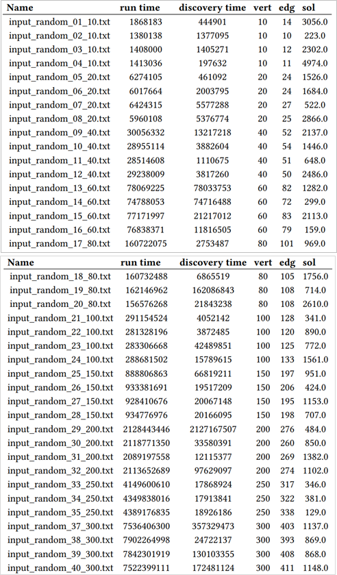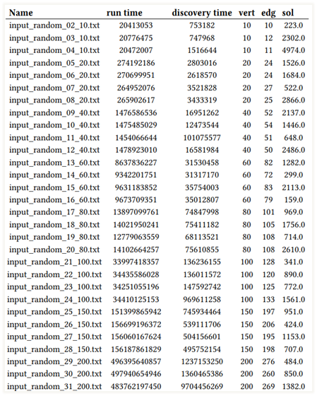 Таблица демонстрирует результаты измерений, где run time это полное время работы алгоритма от старта до завершения. Оно отражает общую вычислительную сложность; discovery time — это момент в процессе работы, когда алгоритм впервые находит правильный ответ. Эта метрика показывает, как быстро алгоритм приходит к верному решению, даже если после этого он продолжает работать для его подтверждения. Атрибут sol (solution) — это ответ на задачу, стоимость минимального разреза. На рисунке ниже, представлены результаты работы алгоритма Штера-Вагнера: