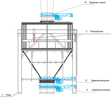 Задвижки двухпозиционные (ОТКРЫТА – ЗАКРЫТА), приводятся в действие мотор-редуктором и оснащены датчиками концевых положений. Одна нижняя задвижка выгрузки смонтирована на весовом бункере, а вторая на подвесовом бункере. Между затворами смонтировано мягкое соединение. Мягкое соединение также связывает верхнюю задвижку подачи с самим весовым бункером.