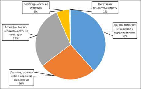 Даже легкие регулярные активности — прогулки, йога, плавание — оказывают выраженный психотерапевтический эффект. Среди положительных сторон спорта, влияющих на психоэмоциональное состояние можно выделить также социальный аспект. Спортивные мероприятия часто способствуют формированию социальных связей и поддержанию активной социальной жизни, что также важно для каждого человека. На рис.2 видно, что 38% опрошенных действительно считают, что спорт помогает справиться с переживаниями и поднять настроение.