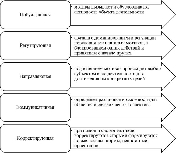 Создание мотивационной теории невозможна без учета функций, которые выполняют мотивы. Побудительные причины или основания для действий или поступков являются мотивами. В психологии мотивы отмечают, как внутренние потребности, определяющие направленность и активность поведения человека. К ним определяют следующие функции мотивов (рисунок 2):