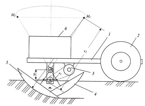 1 – рама; 2 – опорные колеса; 3 – привод; 4-5 – рабочие органы; 6 – груз (вертикальная статическая нагрузка)