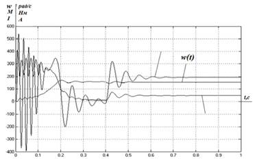Рисунок 5. Переходные процессы момента, скорости и тока при прямом пуске с набросом нагрузки