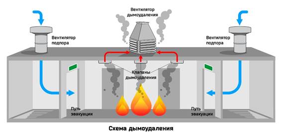 Принцип удаления дыма в месте его образования. Дым из-за своей температуры поднимается вверх и формируется под потолком плотным слоем. Клапаны и вентиляторы устанавливаются именно в верхней зоне помещения для удаления самой задымленной среды. Одновременно с удалением дыма подается наружный воздух в нижнюю часть пространства в определенные зоны. Это как раз зоны эвакуации людей. Данный процесс создает «подпор», который не дает проникнуть дыму в эти зоны.
