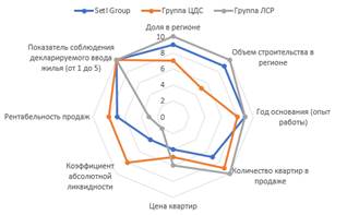 2.1. Многоугольник конкурентоспособности. Данный метод позволяет наглядно сравнить компанию с конкурентами по ключевым параметрам. Традиционно к ним относятся: доля рынка, объем строительства, рентабельность, финансовая устойчивость и т.д. (Рис. 1).