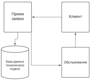Архитектура системы включает четыре основных модуля: «Клиент» (учёт арендаторов), «Приём заявки» (фиксация обращений), базу данных (хранение эксплуатационных сведений) и «Обслуживание» (управление ремонтными работами). Заявки автоматически регистрируются, маршрутизируются в технический отдел и после выполнения закрываются с синхронизацией статусов.