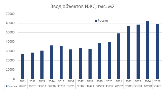 Рисунок 1. Объёмы ввода индивидуального жилья в РФ по годам [4]