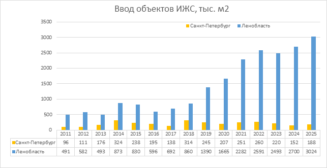 Рисунок 2. Объёмы ввода индивидуального жилья в Санкт-Петербурге и Ленинградской области по годам [4]