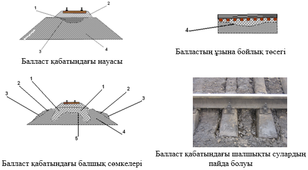 1-ақаулы балласт қабатының шөгуі, 2-балласт қабатының қиыршық тастары, 3-қиыршық тастардың үйіндісі жер төсемесіне жылжу процессінде, 4-жер төсемесінің үйінді топырағы, 5-жер төсемесінің балшықты сөмкелерінің түйісу қабаты.