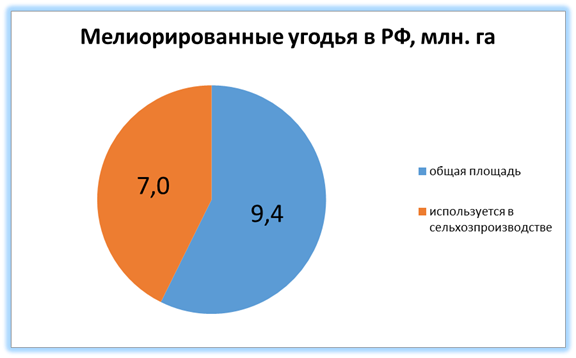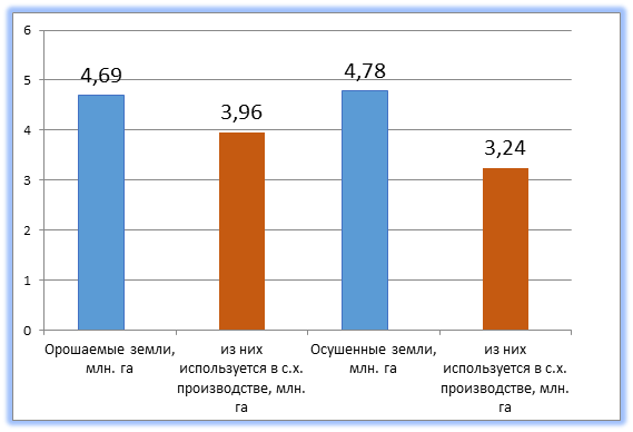 Общая площадь мелиорированных угодий в России составляет 9,4 млн гектаров, из них в сельхозпроизводстве используется почти 7 млн гектаров (Рис. 1.): 4,69 – это орошаемые земли (в сельскохозяйственном производстве используются всего 3,96); и 4,78 – это осушенные земли, из которых в сельскохозяйственном обороте используются всего 3,24 (Рис. 2.).