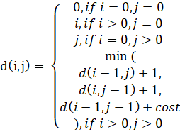 Let s1 and s2 denote the strings to be compared. Let d (i,j) be the edit distance between the prefixes of the strings s1 [1..i]and s2 [1..j]. Then the value of d (i,j) is computed as follows: