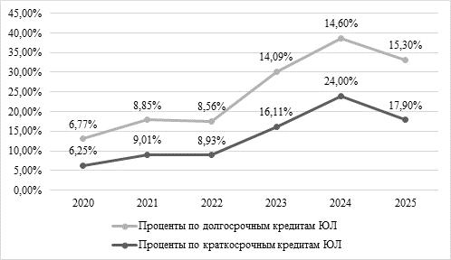 Банковский кредит является наиболее популярным источником заемных средств. Как вид финансирования инвестиционных проектов является подходящим в случае, если процент по кредиту не снижает IRR проекта. Чаще всего кредит используется при недостатке собственных средств для реализации инвестиционной программы. В настоящее время, банковский кредит является наиболее невыгодным источником финансировании по причине высоких процентных ставок. На Рисунке 2 приведены средние значения ставок по банковским кредитам, при этом для отдельных хозяйствующих субъектов они могут быть выше, опираясь на их финансовое состояние, стоимость обеспечения, местонахождение юридического лица. Согласно данным на Рисунке 2 приведена динамика банковских процентов на кредиты юридическим лицам. Можно заметить, что несмотря на снижение процентов, ставки являются высокими, что делает банковский кредит невыгодным для финансирования проектов, несет за собой риск потери ликвидности и финансовой устойчивости, а также делает реализацию инвестиционных проектов дороже. Однако, тенденция на снижение процентов, может сделать данный источник финансирования более привлекательным в будущих периодах, а также дает возможность на рефинансирование кредитов, полученных в период высоких ставок.