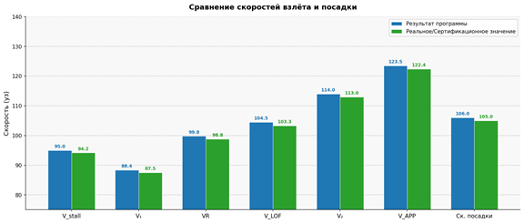 Рисунок 1. Сравнение скоростей взлёта и посадки (расчётные и реальные значения)