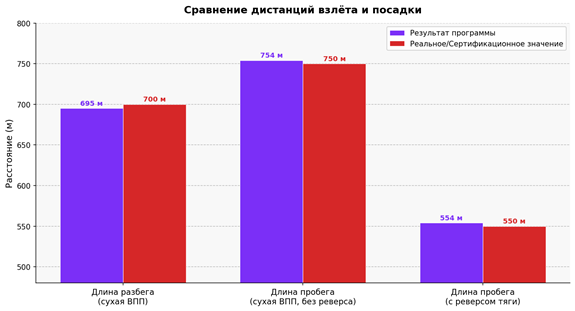 Рисунок 2. Сравнение дистанций взлёта и посадки (расчётные и реальные значения)